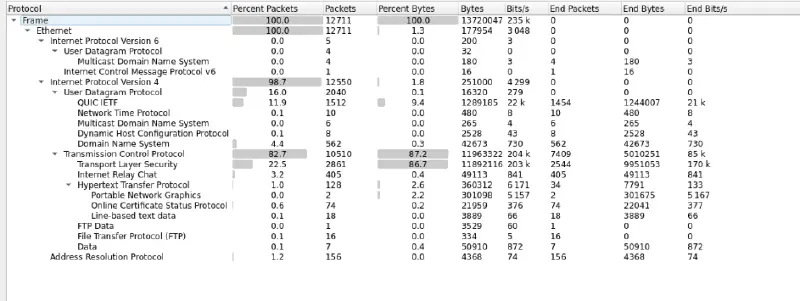 Opening the attached PCAP file and looking at the packet hierarchy, we see the following.
