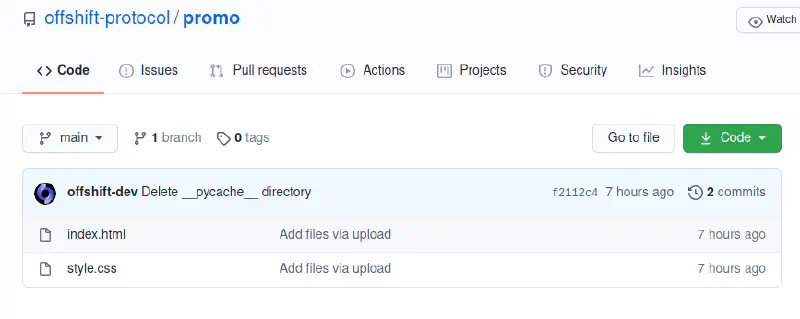 So we found two github accounts that has the name offshift in them. The offshift-dev account contains one repository that doesn’t seem to be the one we are looking for. The offshift-protocol account on the other hand contains one repository named promo which was recently updated. Lets take a closer look at that.