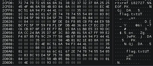 When opening the PDF it contains no interesting information. When opening the decoded file in a hex editor we can find out that a Zip file is embedded at the end of the file.