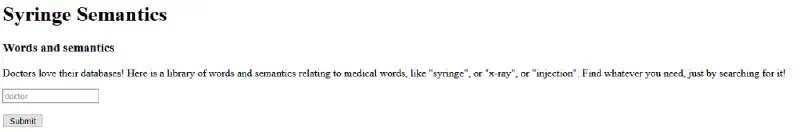 Doctors love their databases! Here is a library of words and semantics relating to medical words, like “syringe”, or “x-ray”, or “injection”. Find whatever you need, just by searching for it!