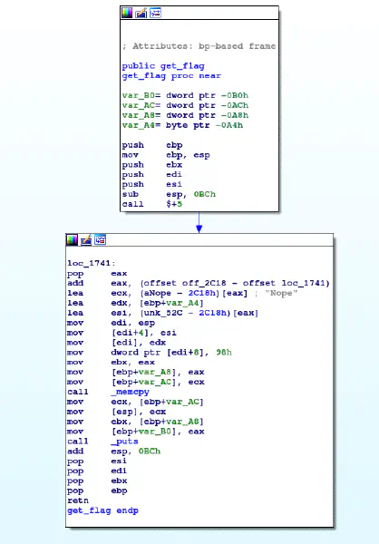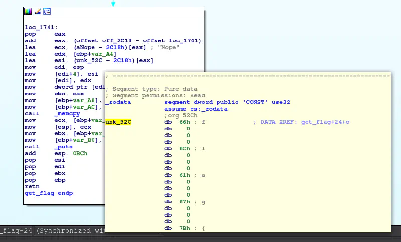 Opening the file in IDA we can see a function named get_flag.