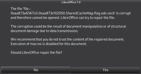 Dumping the file flag.ods and opening it we get a question if we want to repair the broken file.