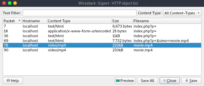 For this challenge we get a pcap, opening the capture file in Wireshark we can see some HTTP traffic. Opening the ‘Export objects -> HTTP’ window we can see the following objects.