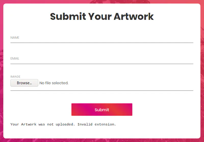 <pre>Your Artwork was uploaded! at <a href='uploads/88c18fcbf6231d7c4d4940bea6d11c85.php'>uploads/88c18fcbf6231d7c4d4940bea6d11c85.php</a></pre>