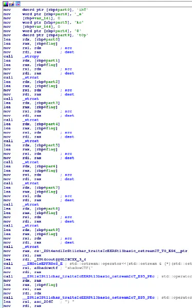 So, format has the value sh@d0w, part1 has the value {, part2 has the value reversing and part3 has the value }. Now we can use those values and the others found in the flag printing code to get the flag.