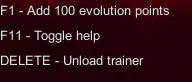Compile the trainer and loader and start the game and the trainer, and when we press F1 we will see that the evolution points is increased with 100 on each key press.