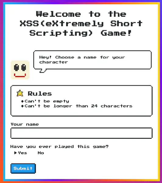 window.name = 'XSS(eXtreme Short Scripting) Game'