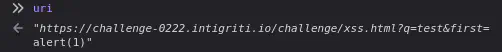 So lets try it out. Navigating to https://challenge-0222.intigriti.io/challenge/xss.html?q=test&first=%0aalert('eval') and printing the uri variable in the console shows us that the newline is interpreted correctly.