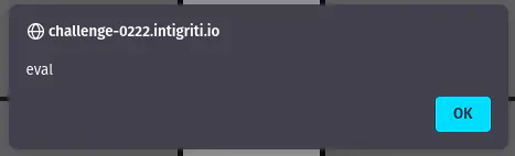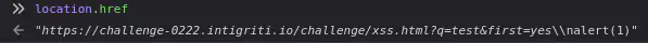 Lets start by verifying that the method works by calling eval("https://challenge-0222.intigriti.io/challenge/xss.html?q=test&first=yes\nalert(1)") in the console. And sure enough we trigger an alert.