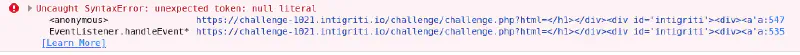 Now we see that the created script element has four additional characters which we should be able to control. If we change the payload to challenge.php?html=</h1></div><div id='intigriti'><div><a'a we get the following script.
