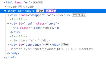 Taking a look at the inspector to see where our text is outputted we find it in a h1 element. Here we also see the script tag that is added to the body element.
