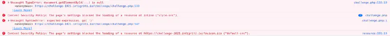 Using the payload challenge.php?html=<div id='intigriti'></div> we see that we can inject html into the page.