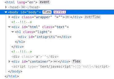 Using challenge.php?html=</h1></div><div id='intigriti'></div> we see that we can close the parent tags. But our element still isn’t the last one in the body.