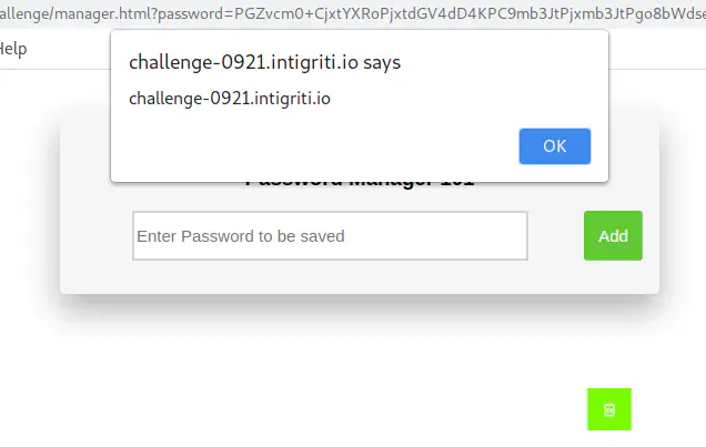 Lets try to inject something. Base64 encoding <h1>test</h1> and using the encoded value for the password parameter we get manager.html?password=PGgxPnRlc3Q8L2gx. Using this and adding a password we can see our injected HTML in the password list.