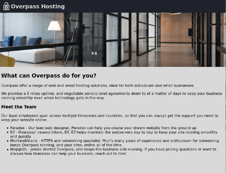 Overpass 3 - Hosting is the third box in the Overpass series on TryHackMe. The goal is to find the web, user and root flags.
